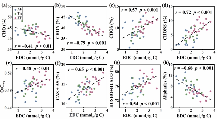图4 EDC与不同区域中DOM分子组成参数之间的关系