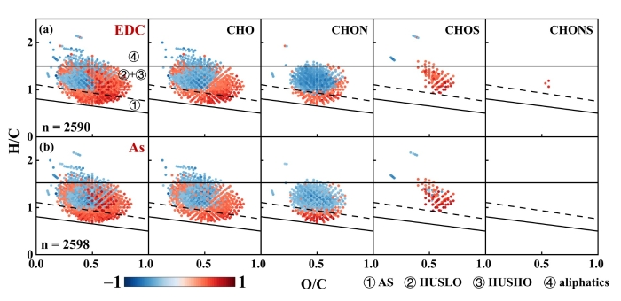 (2)沿流动方向,难降解有机质的含量不断上升,且与EDC的正相关关系(图4)说明了难降解有机物是电子穿梭的主要贡献者。具体地,含CHO-和CHON-的芳香性物质和含CHOS-和CHONS-的高氧高不饱和物质参与电子穿梭(图5)。