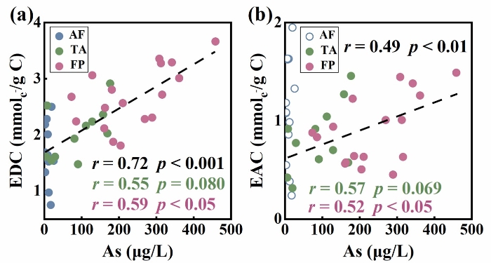 (3)地下水As浓度与EDC和EAC均呈显著正相关。特别是高砷地下水(p < 0.05)(图6)。这说明DOM的电子穿梭加速了地下水As的富集。