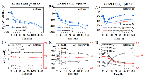 (1)在Fe(II)aq催化水铁矿晶相转化的不同路径中,体系还原能力主控因素不同:当pH和Fe(II)aq浓度较低时,水铁矿逐渐转化为亚稳态纤铁矿和稳态针铁矿,还原能力取决于矿物组成,并随转化而增强;而pH和Fe(II)aq浓度的增加促进了磁铁矿生成,并导致pH和Fe(II)aq浓度下降,进而引起还原能力的减弱(图2)。