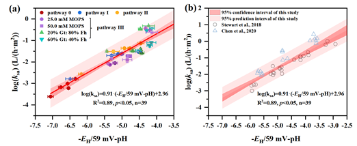(2)在水铁矿晶相转化的不同路径中,体系还原能力可与硝基苯还原速率建立同一线性自由能关系(R2=0.89,图3),且斜率接近1,说明硝基苯还原受热力学驱动力控制,是单电子转移过程,证明线性自由能关系可拓展应用于水铁矿晶相转化过程中。