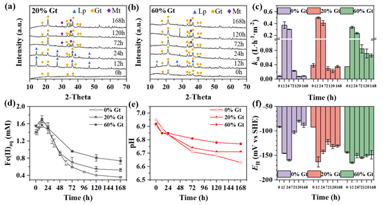 图4 针铁矿-水铁矿共存体系的矿物组成、硝基苯还原速率以及还原能力的变化