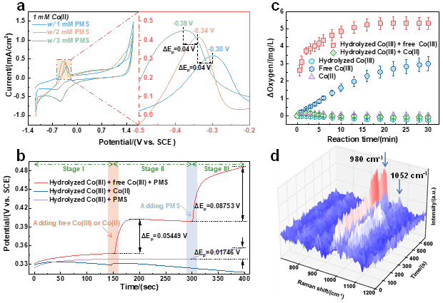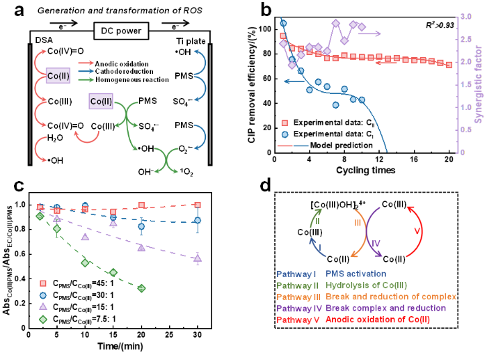 针对以上科学问题,我校水资源与环境学院冯传平教授团队博士生安宁在陈男教授的指导下联合清华大学李淼教授,以Co(II)为模型催化剂,对电化学增强型的PMS-AOPs体系(EC/Co(II)/PMS)中的钴循环机制进行了深入研究,取得的创新性认识如下:
