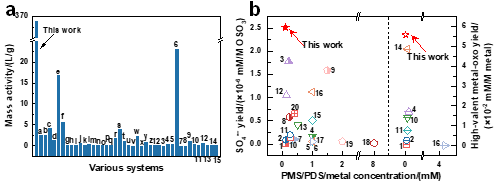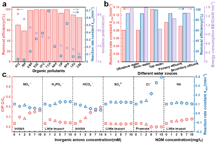 在催化活性方面,电化学过程中Co(II)的质量活性达到368.87 L/g,优于文献报道的多种PMS催化剂。这表明EC/Co(II)/PMS体系能够显著减少多相催化剂合成中对金属盐的需求,并降低催化氧化过程中氧化剂的用量,该体系在减少金属浸出方面也展现出显著优势。此外,由HO-OSO3-、Co反应生成的SO4·-和Co(IV)=O产率分别达到2.51×10-6 mM/M OSO3和5.57×10-2 mM/M Co,与现有研究相比处于较高水平。上述优势可能源于电化学过程对Co(II)/Co(III)氧化还原循环的有效驱动能力。因此,实现均相反应中金属离子催化剂的稳定高效循环对污染物持续降解至关重要。