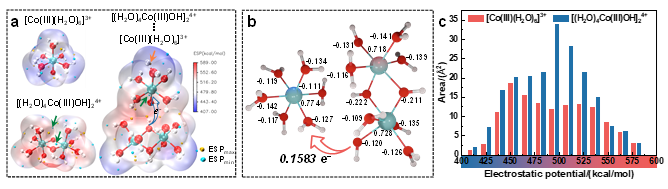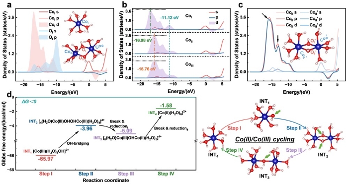 Co(II)的电化学再生维持了催化氧化反应的持续进行,这是仅用Co(II)无法实现的效果。我们对电化学过程中独特的钴循环机制进行了深入分析:通过阳极氧化产生的Co(III)被发现是破坏水解二聚体复合物的关键物种,这使得Co(III)能够通过球外和球内两种电子转移机制发生还原与释放。具体而言,[Co(III)OH]24+二聚体中负责桥连的羟基氧的孤对电子通过球外电子转移至Co(III),这一过程破坏了氧原子与钴之间的电子分布,进而促进了二聚体内Co(III)通过球内电子转移发生还原。这揭示了电化学调控的一个新方面,吉布斯自由能计算明确证实了该循环过程的自发性。