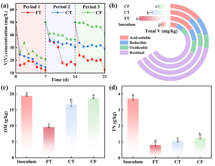 (1)冻融循环条件(FT:-4~4 ℃)与恒温条件(CT:4 ℃和CF:-4 ℃)微生物还原性能及光谱学表征:较恒温条件相比,冻融循环体系显著加速了微生物 V(V) 还原效率,增加钒的生物利用度,加速了对沉积物中有机质和总氮的利用(图1)。光谱学技术证明微生物将 V(V) 还原为 V(IV),以无定形的 VO2 形式存在(图2)。
